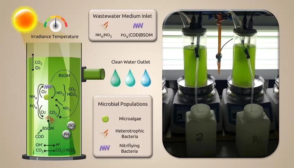 Microalgae-bacteria consortia (MBC)-based treatment systems are a promising bioremediation step because microalgae can make oxygen on their own when exposed to light (photooxygenation), lowering the cost of running mechanical air circulation systems. This oxygen generation provides the necessary conditions for heterotrophic bacteria (HB) to oxidize chemical oxygen demand (COD) and for nitrifying bacteria (NB) to convert ammonium into nitrate (NO₃⁻) during the nitrification process. In this way, HB produces CO₂, which microalgae and NB use as a carbon source. MBC systems have a high capacity for nutrient removal. This capability is often the result of the ability of microalgae to absorb nutrients and the mechanisms related to NB. MBC can revolutionize conventional wastewater treatment by using sunlight as an energy source to drive the biological process. In this way, operating costs are reduced, and potentially valuable products can be obtained from wastewater by converting biomass into biofertilizers, biofuels, and bioproducts. Additionally, the absorption of CO2 by microalgae reduces its emissions compared to conventional activated sludge (CAS). The MBC plant effluent is expected to discharge treated effluent and meet recycling standards (Oviedo et al., 2023).This study investigates Microalgae-Bacterial Consortia in Wastewater Treatment to enhance nutrient removal efficiency.