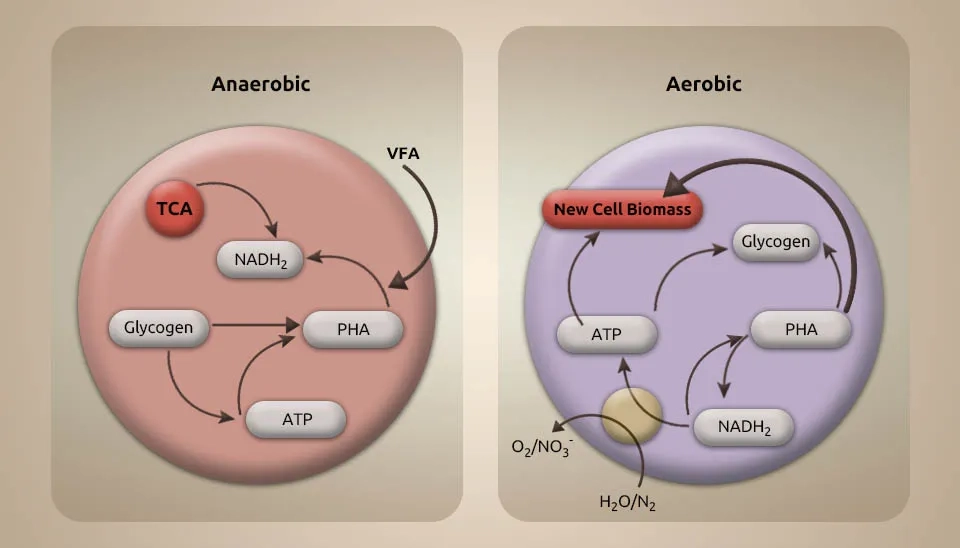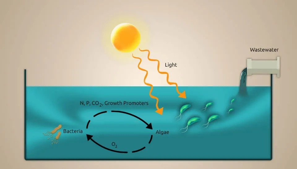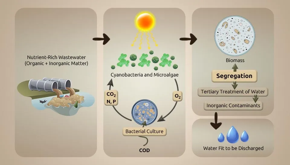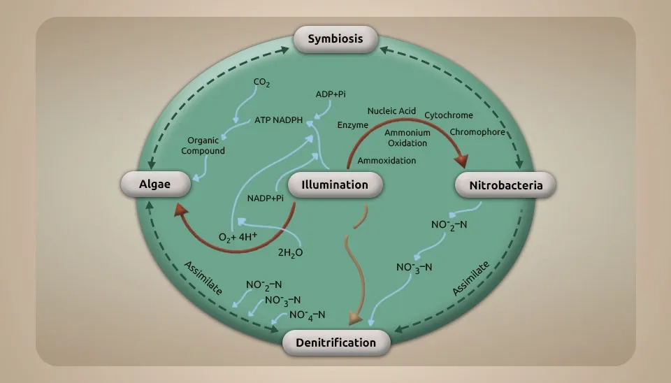 Due to the wastewater discharge of rivers, seas, and oceans, each year, a lot of phosphorus and nitrogen enter natural water bodies (Bi et al., 2019). In biological wastewater treatment systems, microalgae, as tiny aeration devices, help other bacteria by producing oxygen and fixing CO2. It causes eutrophication and harms the environment. The oxygen production by microalgae can help establish a relationship between them and anaerobic bacteria during wastewater treatment. Also, the oxygen production by microalgae can help bacteria during the breakdown of organic carbon, and the carbon dioxide produced during this degradation and bacterial respiration provides essential carbon for microalgae photosynthesis. Using microalgae in denitrification processes requires careful culture management to control the dissolved oxygen (DO) level (Jia & Yuan, 2017). Moreover, synergistic interactions between microalgae and bacteria in consortia can share important metabolites to meet their nutritional requirements (Nagarajan et al., 2022). Microalgae-bacteria interaction in wastewater treatment can help recycle nutrients toward a sustainable bio-economy (Nguyen et al., 2021).The microalgae-bacteria interaction in wastewater treatment creates a synergistic environment for nutrient removal.
