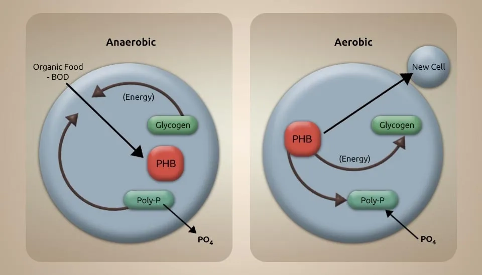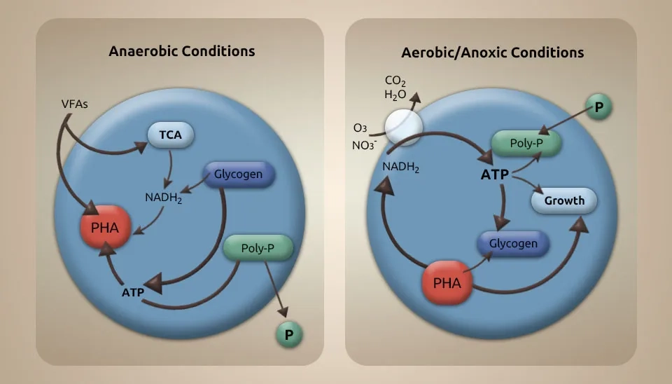 Microalgae treatment after the improved biological phosphorus removal process and phosphate precipitation are two mechanisms for phosphorus removal in the microalgae-bacteria consortium system. The PO4-3 and CO2 created by bacteria can be converted to oxygen by microalgae in this system (Higgins et al., 2018). Phosphate precipitation of the wastewater happens during the day because of microalgae photosynthesis. The process of photosynthesis in microalgae causes a change in the pH of the environment. Each nitrate ion breaks down into ammonia and produces one hydroxide ion. Hydroxide ions help bacteria to release compounds that destroy microalgae. Algaecides combat microalgae, leading to the release of EPS. The release of EPS led to the precipitation of phosphorus (Sells et al., 2018).