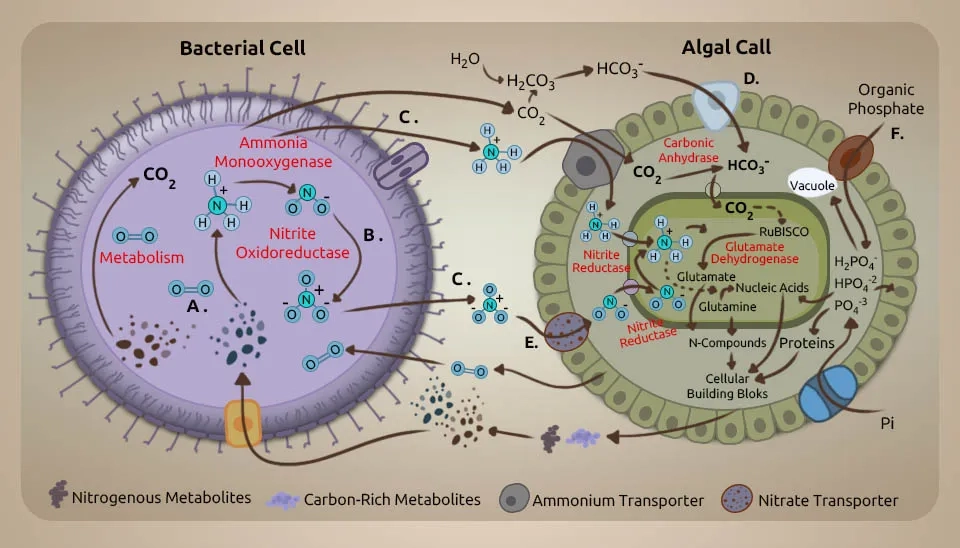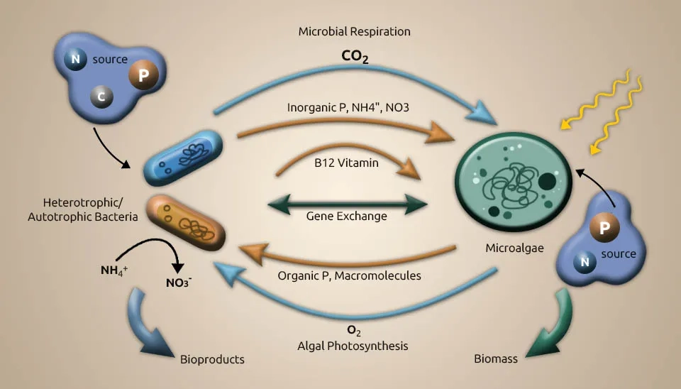 A comprehensive understanding of the interaction between microalgae and bacteria is fundamental to improving treatment execution, such as by increasing total nutrition removal. Microalgae and bacteria interact in different ways, from mutualism to antagonism. Microalgal and bacterial communities interact based on energy and nutrition trade, flag transduction, and gene exchange. A few cofactors that are imperative for metabolic processes by microalgae and bacteria are Microalgae generate oxygen (O₂) for bacteria to utilize as an electron acceptor and energy source to remove organic matter, whereas algae use carbon dioxide (CO₂) from bacterial respiration as the carbon source (Chan et al., 2022). The antagonistic impact may happen in a dark condition when microalgae and bacteria compete for oxygen in the respiratory process and due to the deterioration of dead cells. Microalgae generate hydrogen in the dark in low-oxygen environments through a process called denitrification. During the day, photosynthesis modifies the carbon stores that control hydrogen generation at night. In addition to the light/dark cycle, letting microalgae grow to very high biomass levels can also cause self-shading because a low-oxygen environment is suitable for making hydrogen (Rezvani et al., 2020). Without the injection of external hydrogen gas, the bacteria-microalgae consortium achieves the highest nitrate removal rate per large biomass. Vitamin B is imperative to the beneficial relationship between microalgae and bacteria. Additionally, vitamin B12 is delivered by bacteria either in aerobic or anaerobic conditions. Vitamin B12 helps control microalgal growth and community composition (Blifernez-Klassen et al., 2021). Azospirillum brasilense and Chlorella vulgaris were immobilized and grown together. This caused Chlorella vulgaris to grow faster because Azospirillum brasilense makes riboflavin and lumichrome (vitamin B), which Chlorella vulgaris needs to develop and use. In addition to shared development, microalgae and bacteria show bactericidal and algicidal impacts separately toward certain species (Ramos-Ibarra et al., 2019).