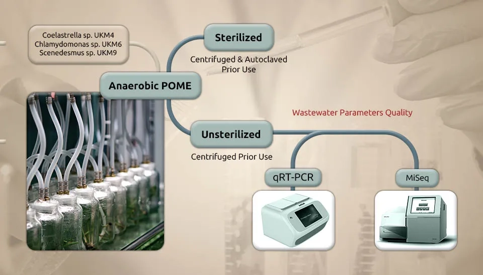 Udaiyappan et al. (2020) investigated the interaction of microalgae-bacteria in palm oil mill effluent treatment. The wastewater from a Palm Oil Mill Effluent (POME) was gathered from an anaerobic pond (anaerobic POME). POME contains considerable nutrients and a critical number of inborn microorganisms that devour the nutrients for their growth. The POME that wasn’t sterilized was pre-treated by centrifugation at 6800 g for 10 min to remove suspended solids and was kept at a temperature of 4°C until needed. The POME was autoclaved at 121°C for 15 minutes to prepare the sterilized POME. After the pre-treatment step, the POME was separated into fixed and unsterilized parts before use. Three native microalgae (Coelastrella sp., Chlamydomonas sp., and Scenedesmus sp.) isolates were used as a culture in this study. Around 10 % (v/v), 20 % (v/v), and 30 % (v/v) microalgae cultures at the exponential stage (dry cell weight ∼400 mg/L) were freely immunized into 2 L flasks containing unsterilized and sterilized POME, respectively. At that point, the cultures were hatched at room temperature with a continuous light supply at 10,000 lx and aeration at 0.25 vvm.