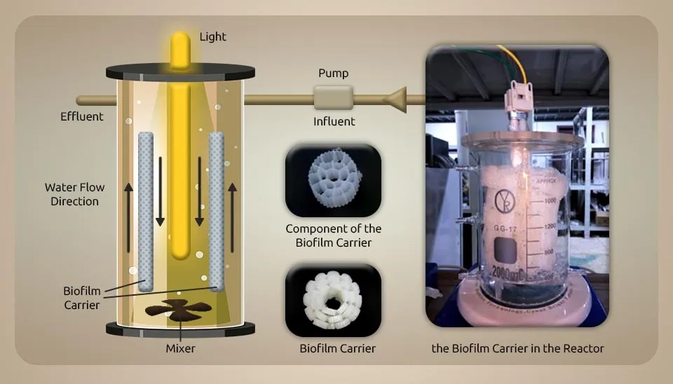 ( Gou et al., 2020) constructed a biofilm reactor of microalgae-bacterial consortia in wastewater treatment. The characteristics of this bioreactor are shown in the figure below. The volume, light intensity, mixer speed, temperature, and biofilm carrier (polyethylene) were 2L, 200 μmol m⁻² s⁻¹, 100 rpm, 28 °C, and 20 mm in synthetic wastewater, respectively. The COD, NH4+-N, and PO4-3-P concentrations were 300 mg L-1, 40 mg L-1, and 10 mg L-1, respectively. The wastewater treatment plant collected bacteria and microalgae from the activated sludge (AS) and the secondary settler's divider. The reactor's beginning sludge and microalgae concentrations were 900 mg L⁻¹ and 900 mg L⁻¹, respectively. MBC systems need high hydraulic retention times (HRTs, 2–10 days) to efficiently remove pollutants from domestic wastewater. Gou et al. made a new type of MBC biofilm reactor to decrease HRT. They indicated that the removal of ammonium and phosphate is 90% and 30%, respectively, when HRT is 12 hours. Reducing and increasing the HRT to 8 and 24 hours did not improve removal efficiencies. An LED light provides the light source for microalgal growth. In fixed DO concentration (2 mg L⁻¹), the organic matter and ammonium removal rates were 70% and 50%, respectively. The removal efficiency of COD was 18.63 mg COD L-1.h-1 and 25.35 mg COD L-1.h-1 from illumination and aeration. Also, the removal efficiency of phosphate was 0.26 mg L⁻¹ h⁻¹ and 0.43 mg L⁻¹ h⁻¹ in illumination and aeration, respectively (Gou et al. 2020) .