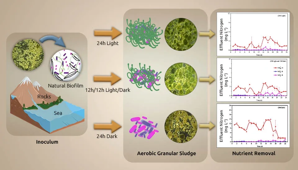 Ji et al. (2021) investigated microalgal-bacterial granular sludge under simulated natural cycles for municipal wastewater treatment. They used Microalgal-Bacterial Granular Sludge (MBGS) in synthetic wastewater under aerobic and non-aeration conditions in a 250 mL glass beaker. The dominant microalgae and bacteria (Chlorophyceae, Alphaproteobacteria, and Sphingobacteriia) were identified in MBGS. The average size and 5-min Sludge Volume Index (SVI5) of MBGS were 0.72 mm and 22.3 mL/g, respectively. Tests were conducted in glass reactors with a 60-mL volume, a temperature of 25°C, and a shaking speed of 150 rpm min⁻¹ under a 12:12 D/L cycle. Carbon sources in this study were acetate, glucose, and sucrose. The DO concentration was 4–5 mg L⁻¹ and 5–8 mg L⁻¹ in the dark and light phases. Also, HRTs were 2 h and 4 h in light and dark stages, respectively. The initial MBGS concentration and illumination intensity were set to be 14 g L⁻¹ of volatile suspended solids (VSS) and 200 μmol m⁻² s⁻¹. In the daytime (HRT of 2), there were about 94.9% of organics, 69.5% of NH4+-N, and 90.6% of PO4-3-P, and during the nighttime (HRT of 4 h), there were 93.1% of organics, 62.5% of NH4+-N and 80.8% of PO4-3-P. Chlorophyceae were found to be the main ones that got rid of the phosphorus because they have H+-exporting adenosine triphosphate (ATPase) and H+-transporting two-sector ATPase. Also, the main ones responsible for the ammonia removal were found in Alphaproteobacteria due to glutamine synthetase and glutamate dehydrogenase.
