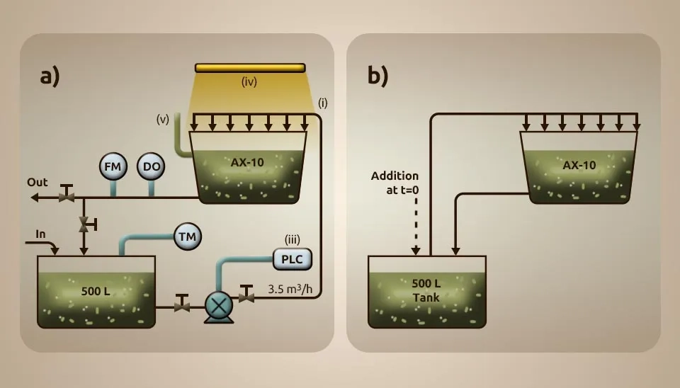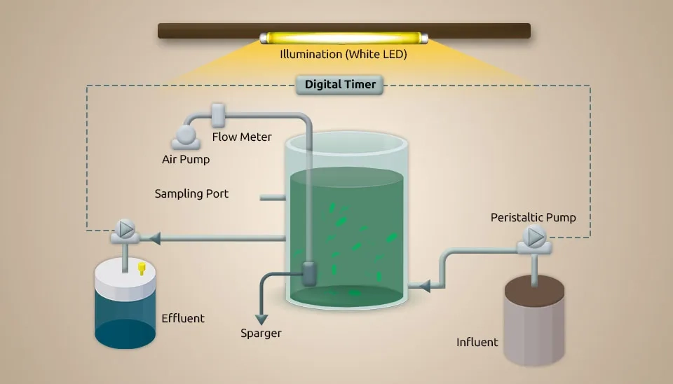 Sánchez-Zurano et al. (2021) investigated a new model of microalgae-bacteria consortia for biological treatment of wastewaters named A Microalgae-Bacteria Consortia (ABACO). Scenedesmus Almeriensis was used to inoculate the photobioreactors, which were maintained photoautotrophically in spherical flasks with a volume of 1 L using the Arnon medium. Other conditions were artificially illuminated, such as CO₂-enriched air (1%), pH (8.0), temperature (25°C), a 12:12 h L/D cycle, and light intensity of 750 µE m⁻² for the tests. 20% Scenedesmus Almeriensis and 20% diluted pig slurry were put into two photobioreactors made by hand out of polymethyl methacrylate. The reactors were 0.08 m in diameter, 0.2 m in height, and could hold 1 L.