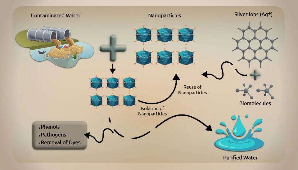 Silver and its components are known for their antimicrobial abilities and are used in disinfection and water treatment applications. The antimicrobial activity of silver nanoparticles derives from their chemical affinity for sulfur and phosphorus. In the presence of ultraviolet light, silver nanoparticles show photocatalytic activity, and also in a zerovalent state, they display antimicrobial and antiviral activities. In recent years, silver nanoparticles have been used in water purification plants and different water and wastewater treatment applications and have shown promising results. Some devices and water filters (e.g., Aqua Pure and Marathon Systems) that are available in the market also use silver nanoparticles. Silver nanoparticles are also utilized in ceramic microfilters to disinfect pathogens (Dasgupta et al., 2020).