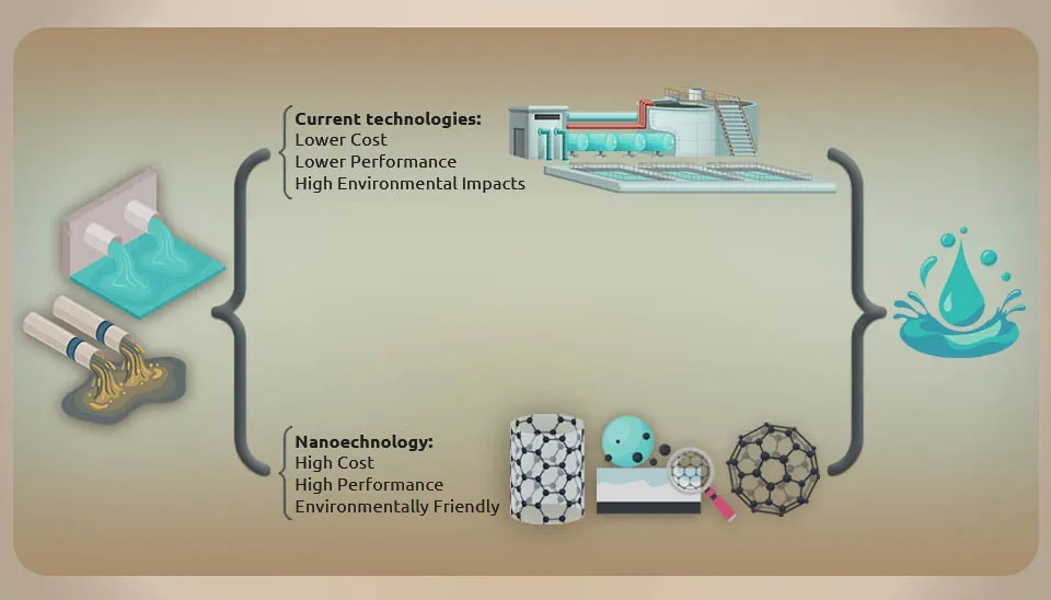 The research framework program in the European Union has provided US$92 million for water innovations and US$686 million for nanotechnology in order to combine nanotechnology and water treatment (Gehrke et al., 2015; Horizen, 2020). This emphasized the importance of utilizing nanotechnology in water and wastewater treatment applications. Everyone needs access to safe water, which requires the utilization of new, cheaper, and more efficient technologies for water purification while considering energy requirements and environmental impacts. Innovative technologies, such as nanotechnology, can improve treatment effectiveness, expand access to safe water, and promote energy and infrastructure efficiency. Nanotechnology is an advanced field that can solve current water and wastewater treatment issues. Materials with physical dimensions of 100 nm or less can be treated using nanotechnology-based water and wastewater treatment approaches (Baruah and Dutta 2009; Brame et al., 2011). Nanotechnology can enable the safe reuse of wastewater and improve access to clean drinking water by filtering out contaminants, including heavy metals (mercury, lead, and arsenic), pathogens, inorganic and organic solutes, and microorganisms, with the help of novel and innovative nanomaterials, nanomembranes, and nanofiltration methods (Kumar et al., 2014; Sudesh Kumar, 2023). Advances in nanotechnology have the potential to replace conventional water and wastewater treatment technologies through control over material size, chemical structure, and morphology (Mauter et al., 2018). In this review, we discuss the nanotechnology-based approaches being developed and used in water and wastewater treatment.