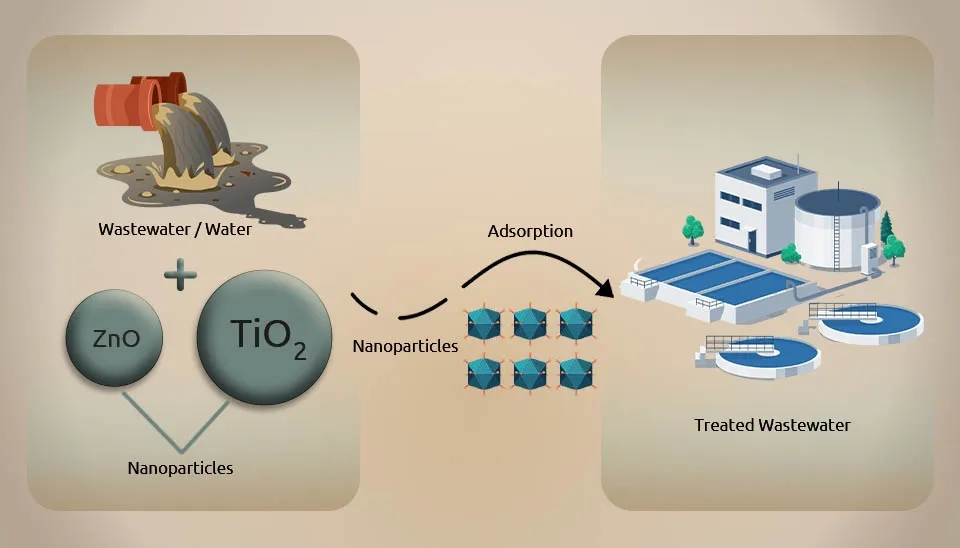 Titania nanoparticles exhibit outstanding antimicrobial activity and are widely used in disinfection applications and decontamination processes. Titanium dioxide nanoparticles (TiO2) can be easily available at a low cost and have low toxicity and high chemical stability (Savage and Diallo, 2005; Kim et al., 2012; Liu et al., 2016). In the presence of UV or sunlight, they show excellent photocatalytic activity. TiO2 nanoparticles can be used as a membrane filter, suspension, or coating on the UV reactor surface. In addition, these nanoparticles are widely used for organic contamination degradation in water and wastewater treatment systems, and studies have shown their removal efficiency (Dasgupta et al., 2020). The main negative property of nano-TiO2 is that ultraviolet activation is required. The main advantage of nano-titanium dioxide over nanosilver is its endless lifetime as a catalyst. Therefore, it remains unchanged during the degradation of organic pollutants and microorganisms (Gehrke et al., 2015). Nano-TiO2 is a metal-based nanoparticle that can be used as a nanosensor to detect different types of organic and inorganic contaminants in water (Kanchi, 2014). TiO2 is also an efficient semiconductor photocatalyst to remove organic dyes from wastewater (Rafique et al., 2019). Zinc oxide (ZnO) nanoparticles are also nanomaterials for water purification due to their antimicrobial properties, strong photocatalytic activity, and ability to remove a wide range of organic pollutants.