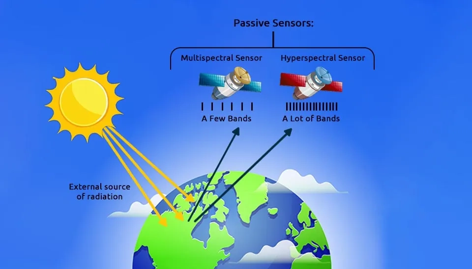 A branch of remote sensing that has attracted the attention of researchers in recent years is passive remote sensing, which is used in water science and its management (quantitative and qualitative studies of water resources). Unlike active remote sensing, passive remote sensing does not have a source of electromagnetic radiation and uses sunlight and the reflection signature of objects to collect information. Using sunlight causes challenges and limitations for passive remote sensing, such as inefficiency at night, noise, and high variability. Passive remote sensing includes accelerometers, radiometers, sounders, imaging radiometers, hyperspectral radiometers, spectrometers, and spectroradiometers. Based on the imaging and scanning mechanisms, passive remote sensing sensors are divided into two categories: scanning sensors ( image plane scanning and object plane scanning) and non-scanning sensors (imaging and non-imaging), Each category has different applications and features. By examining the types and categories of passive sensors, this article can help to further understand the capacity of passive remote sensing in many studies.