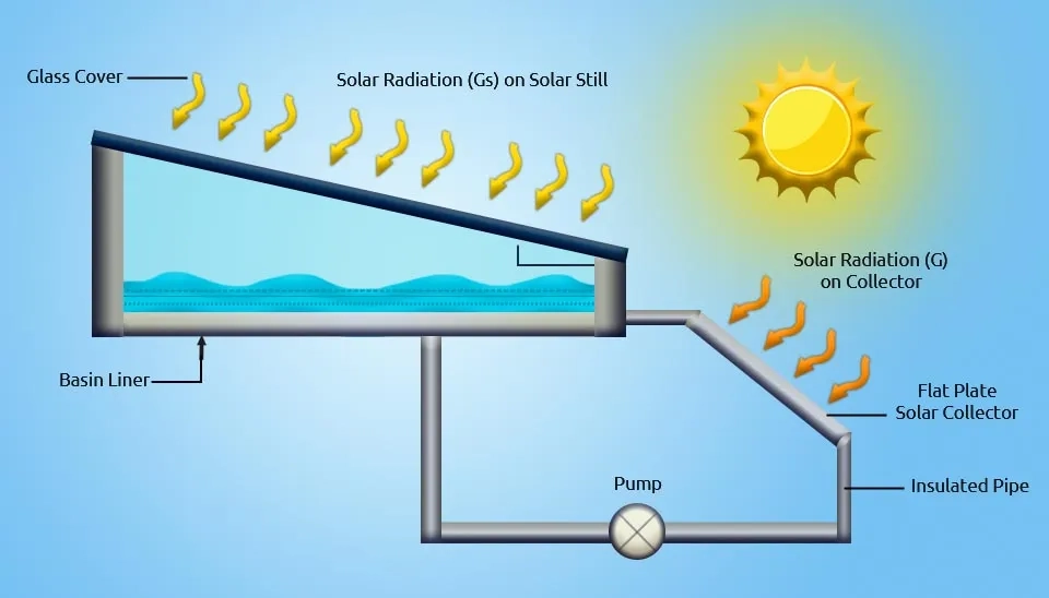 As shown in the figure, there is a significant difference between passive and active solar stills. Here, an additional energy source or additional electrical power is used to enter the thermal energy into the basin using a pump to increase the evaporation rate and continue the distillation even in the absence of solar radiation. Just like passive solar distillation, water will then evaporate due to heat entering the basin and the vapor condenses on the glass cover and will be accumulated in a water tank for further utilization (Ranjan and Kaushik, 2013).