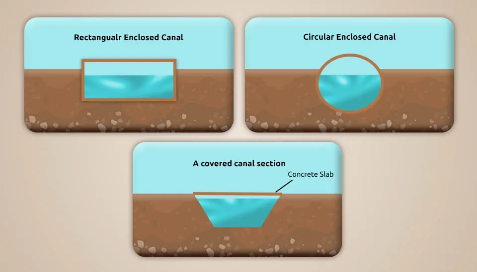 Covering and Enclosing Canals | - Significantly reduces evaporation losses - Prevents vegetation growth, seepage, and water pollution |
