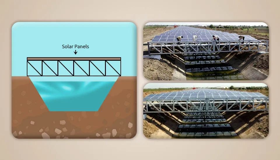 Using fixed and floating solar photovoltaic panels to reduce evaporation losses in irrigation canals offers an innovative and sustainable solution at the intersection of energy and water conservation. Over-canal solar photovoltaic panels have a high potential to reduce water loss by creating a cooler microclimate and reducing evaporation rates. For instance, covering California's extensive canal network with solar photovoltaic panels could save about 39 thousand cubic meters per km of canal annually. In addition to water conservation, these panels enhance photovoltaic performance by operating in cooler conditions and mitigate aquatic weed growth by reducing sunlight penetration. These systems are not only environmentally beneficial but also economically viable since the net present value of solar photovoltaic panels exceeds that of conventional land-based installations by 20–50% (McKuin et al., 2021).