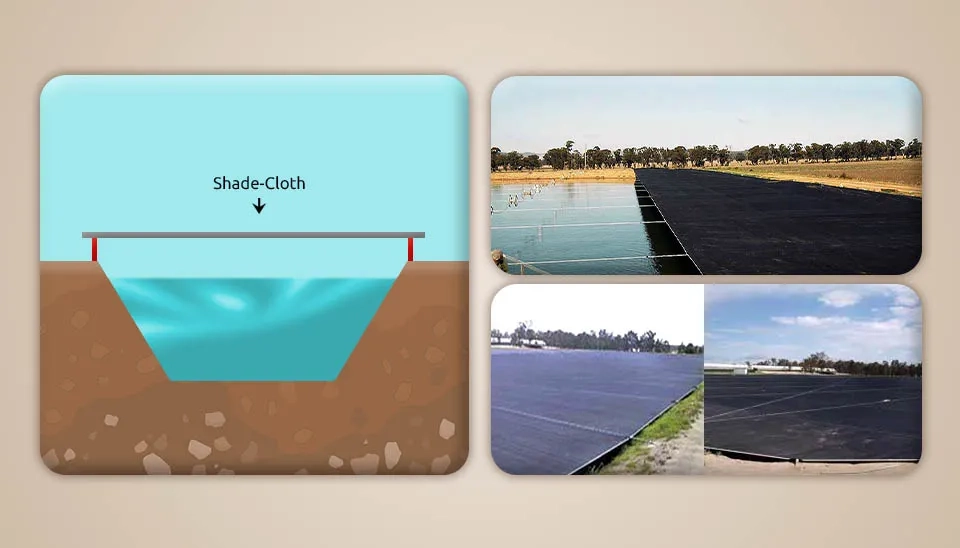 Suspended Shade Cloth Covers | - Reduces evaporation by limiting solar radiation and wind speed - Improves water quality by reducing chlorophyll-a, turbidity, and microbiological contamination - Lasts over 30 years |