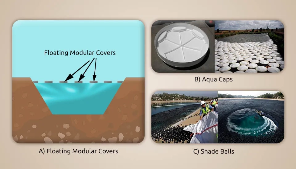 Floating Modular Covers | - Less expensive installation than continuous covers - Can adapt to water body shape due to modular design - Efficient in high-evaporation areas due to drifting ability |