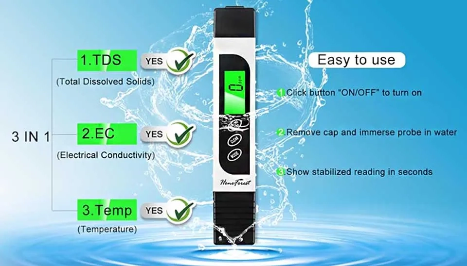 In order to choose the best TDS meter, you must pay attention to all the criteria that we have mentioned in this buying guideline. This helps you to make an informed decision. In addition, try to search online platforms like Amazon and read the reviews and comments of the previous users that have experience using the products. This can give you an overview of which product is better. Most importantly, do not forget to read our article, ‘Top 10 Selling TDS Meters in The World in 2024‘ . The list in the article can be your preliminary choices, then based on other criteria you can add or delete the TDS meters on your list until reaching the best choice. In this article, ranking the product was based on Bayesian ranking rather than traditional methods. This method uses both average rating and number of total reviews; this rectifies the issue of traditional models that a product with 5-star rating and 1 review is higher than a 4.5-star product with 100 reviews. In the article mentioned above, HoneForest TDS Meter (3-in-1)—HGTDS-M7 had the first rank among the available products. This model offers a premium-quality titanium alloy probe and an efficient intelligent chip , making it ideal for testing water, filtered water, distilled water, bottled water, well water, refrigerated water, etc. It is multifunctional, accurate, and reliable. In addition to TDS measurement, it offers EC and temperature measuring as well.