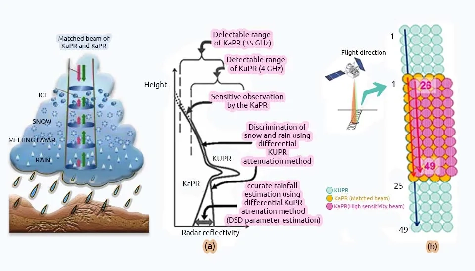 The GPM Core Observatory is equipped with a vital instrument known as the Dual-frequency Precipitation Radar (DPR), which includes a Ku-band radar (KuPR) as well as a Ka-band radar (KaPR). Operating at 13.6 GHz, the KuPR is an enhanced version of the very successful device that was part of the Tropical Rainfall Measuring Mission (TRMM). The KuPR and KaPR on the GPM spacecraft bus are aligned, resulting in the same 5-km footprint location on Earth. The scientific community benefits from the 3-dimensional rain observations and accurate rainfall rate estimations provided by the KuPR and KaPR units (NASA). In tropical areas, the Ku-band radar in the DPR is specifically designed for heavy rainfall, while the Ka-band radar is more effective for light rainfall in higher-latitude regions. The use of DPR is vital in enhancing rainfall estimation accuracy for constellation satellites (Kojima et al., 2021).