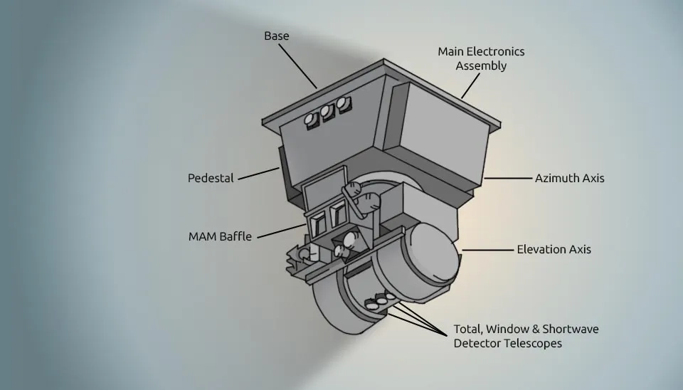 Observation band: 0.3–5 μm (shortwave channel), 8–12 μm (longwave channel), 0.3 ~> 50 μm (Total Wave Channel)