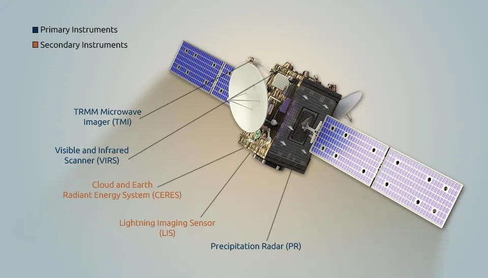 TRMM, utilizing its instruments, facilitated the development of studies of global precipitation system climatology and precipitation measurement technology from space. With five instruments, including a three-sensor rainfall suite (PR, TMI, and VIRS) and two related instruments (LIS and CERES), TRMM provided a unique 17-year dataset of tropical rainfall and lightning around the world. TMI was the only passive microwave instrument in an inclined orbit, and PR is the sole rain radar in space. VIS channels may also serve to improve TRMM rain estimates via pattern recognition techniques. These three rain instruments provide the most comprehensive rain data, which is crucial for climate modeling and severe storm analysis. CERES and LIS flew on board TRMM as instruments of opportunity for the Earth Observation System Program. The CERES instrument measures the Earth's radiation budget, and the LIS instrument investigates the global distribution of lightning. TRMM sensors have performed very well, except for CERES.