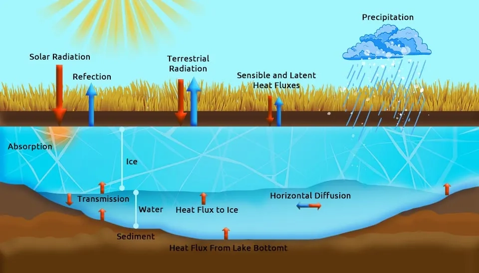 The world's lakes are exposed to different weather conditions during the year. Weather conditions in a year cause a temperature cycle and changes in the amount of solar radiation entering the earth (incoming solar radiation). Lakes located in the equator or near the North and South poles are subject to fewer temperature changes than other lakes due to fewer temperature changes and permanent ice cover on the lake. Climatic conditions and the contact of lakes with the atmosphere created stratification and currents in the lakes. As a result of solar radiation, a portion of the thermal energy is absorbed by the lake, and the rest is reflected depending on the albedo coefficient. Thermal contact with the atmosphere causes the surface temperature of the lake to increase, while the lower layers of the lake are protected from direct contact with solar radiation. The surface of the lake is heated by absorbing solar radiation, and as its temperature increases (exceeds 4 degrees Celsius), the water density decreases. As a result, the warmer water is placed on the surface at a limited depth. The difference in density between the surface layer of the lake and its deeper layers forms thermal stratification (Boehrer and Schultze, 2008).