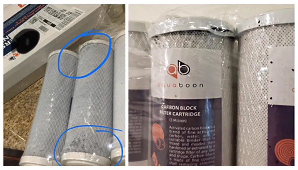 The user received the Aquaboon carbon water filter cartridge in a very bad condition. Filters were broken and full of dirt when they delivered.