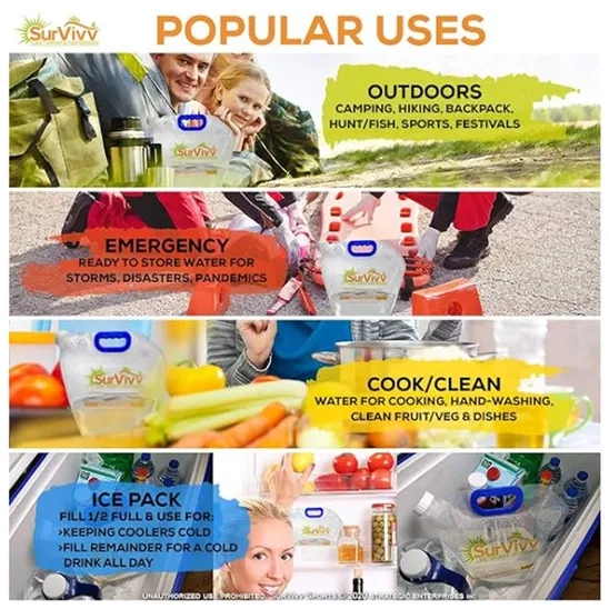 Product Name | SurVivv Premium Collapsible Water Container Bag, No-Leak, Freezable, Odorless, Flat Folding, BPA Free Food Grade Clear Plastic Storage bottle for Sports Outdoors Camping Hiking Backpack 1.3/2.6 Gallon |