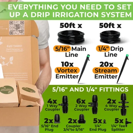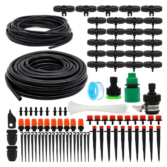 This kit includes 30 - a meter drip irrigation tube (2 specifications), 30 drip tips (3 styles), 1 tubing quick connector, 1 garden hose socket, 1 universal connector, 1 pipe seal tape, 1 puncher, 127 accessories, 1 installation manual. This automatic plant watering kit can well match the household water pressure, and each emitter can be adjusted individually to irrigate accurately and evenly for plants. The PETUOL Drip Irrigation Kit offers versatility, making the product suitable for outdoor areas, including agriculture, lawns, gardens, greenhouses, terraces, greenhouses, swimming pools, and fog-cooling irrigation.