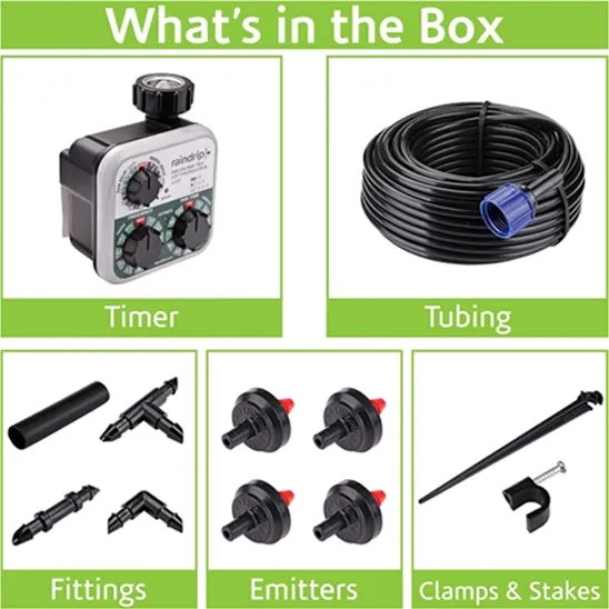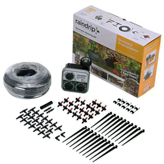 Raindrip plant watering kit provides a convenient and efficient solution for watering plants, vegetable gardens, greenhouses, and any other outdoor space. With this Drip Irrigation Kit, users can simply open a faucet or hose switch to have the system automatically irrigate plants, saving users water and time in the process. All accessories necessary to create a drip irrigation system are included in the kit. This kit includes a water timer, 75 ft. of 1/4 in, and supply tubing with 3/4 in. FHT adapter, 20 PC drippers, tubing hold-down clamps, barbed couplings, elbows, and tees. The Raindrip drip watering kit is easy to assemble with a user-friendly guide.