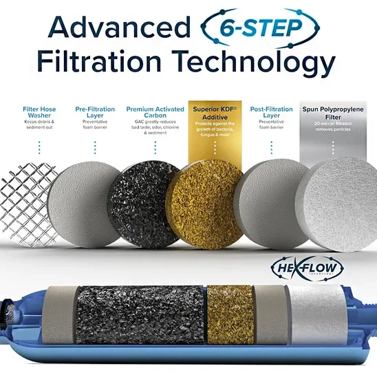 GLACIER FRESH inline Filtration system offers water filters for a variety of applications such as RVs, boats, pools, camping, gardening, and car washing. With its flexible hose design, this filter provides versatility and ease of installation and ensures access to clean and healthy water. It is made with Lead-free and BPA-free materials and features advanced filtration technologies, including Granular Activated Carbon (GAC) and Kinetic Degradation Flux (KDF).