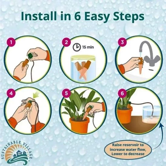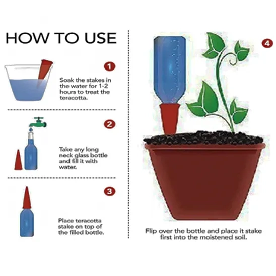 The Remiawy self watering spike is designed to simplify the gardening routine and help plants flourish. It is made from terracotta clay, which is a little fragile due to its property. It can self water the plants for 7-10 days depending on the types of plants drawing water, soil composition, humidity. This Self Watering Planter Insert has an easy installation path that does not require any tools. First, dig a hole in the soil, secondly, insert the plant watering stakes into the soil gently, then fill a bottle with water, connect the bottle with stakes and turn upside down. Finally you can insert 7/8 part of the stakes into the soil to ensure better releasing effect.