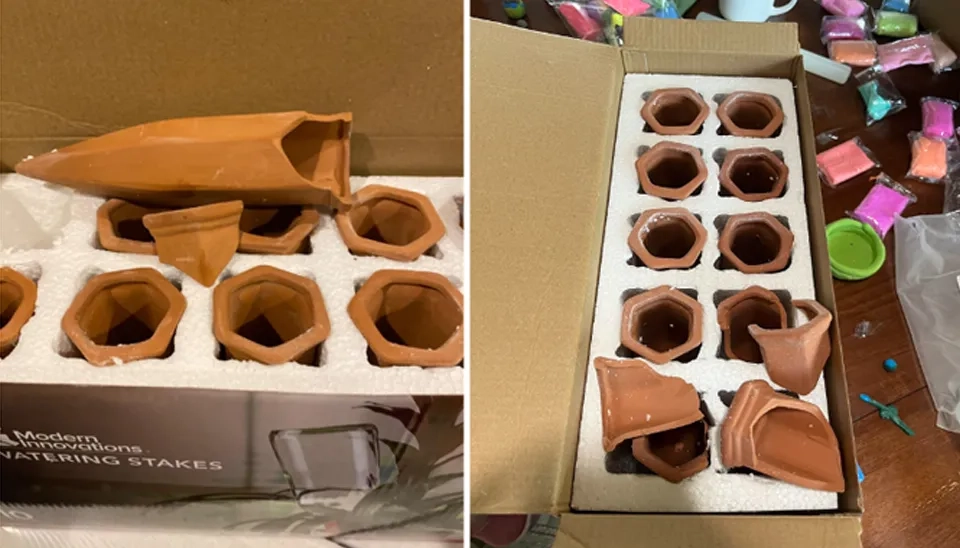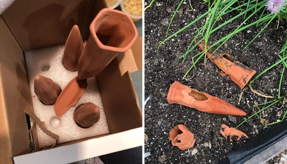 A customer received a damaged and broken product and became unsatisfied with its packaging protection.