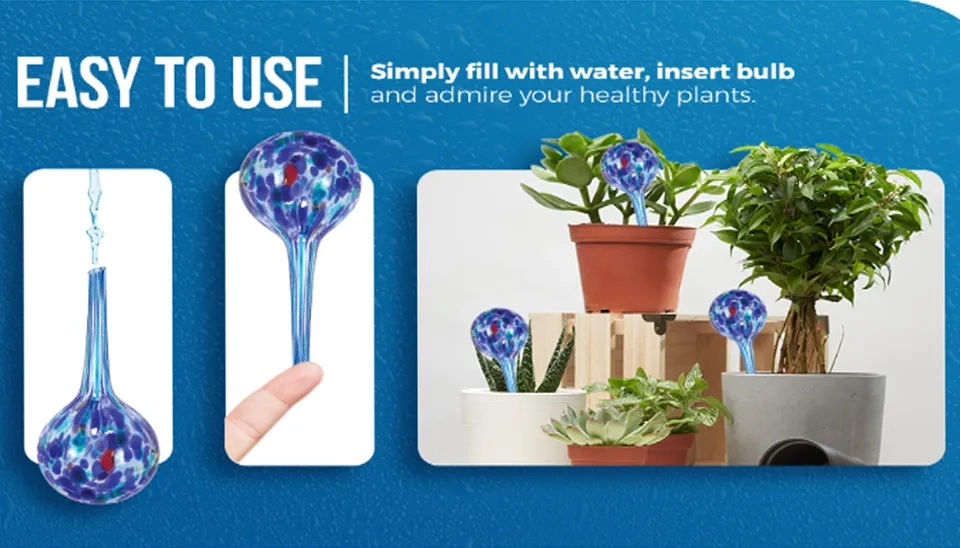 The Tomorotec automatic plant self-watering spikes are designed to provide your plants with a steady dose of water as the soil dries out, ensuring that they receive the proper amount of hydration. The hand-blown glass globes are individually crafted to allow plants to absorb water as needed, promoting plant care and growth. This mini irrigation system is not only effective but also adds a touch of elegance to your planting area. Simply fill the globe with water up to 80% capacity and adjust the insert angle to control the rate of water release based on your plants’ needs. Don't forget to handle these glass bulbs with care and avoid forcing them into the soil to prevent breakage.