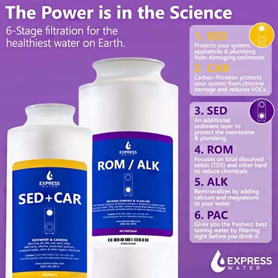 The Express Water 6-stage tankless water filter includes innovative 2-second quick-twist filters, allowing quick replacement and hassle-free maintenance. With its built-in filter lifespan and water quality indicator, you can easily understand the time for filter replacement. This tankless RO water filter has a space-saving design and provides clean, safe water at no time. You can easily install the system by following the instructions and if you have any questions, the customer service is ready to contact you.