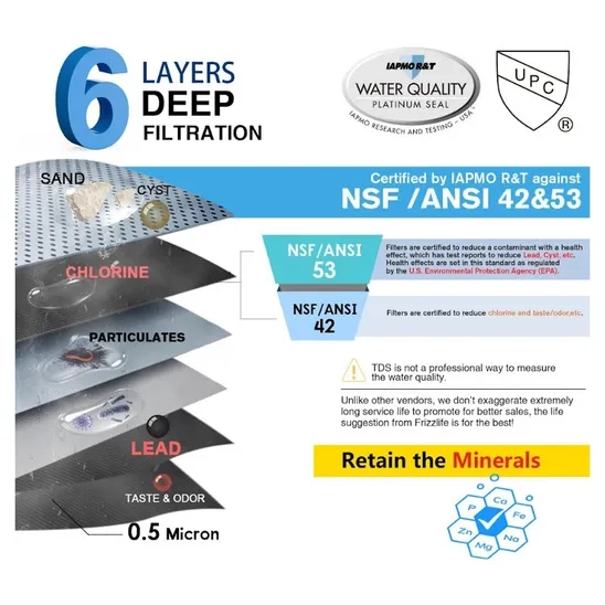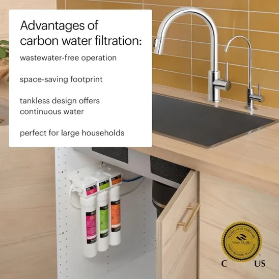 The carbon blocks have been independently tested for heavy metals, large sediments, and all other dangerous impurities. With such a high level of filtration, you can be confident that you are drinking clean and safe water. It can be quickly installed in your kitchen, bathroom, bar, RVs, or office to meet daily water needs. This system is ideal for drinking, cooking, making coffee, pet water, houseplants, humidifiers, skincare, cleaning, etc. It is an ideal choice for environmentally-conscious consumers who want to reduce their energy consumption.