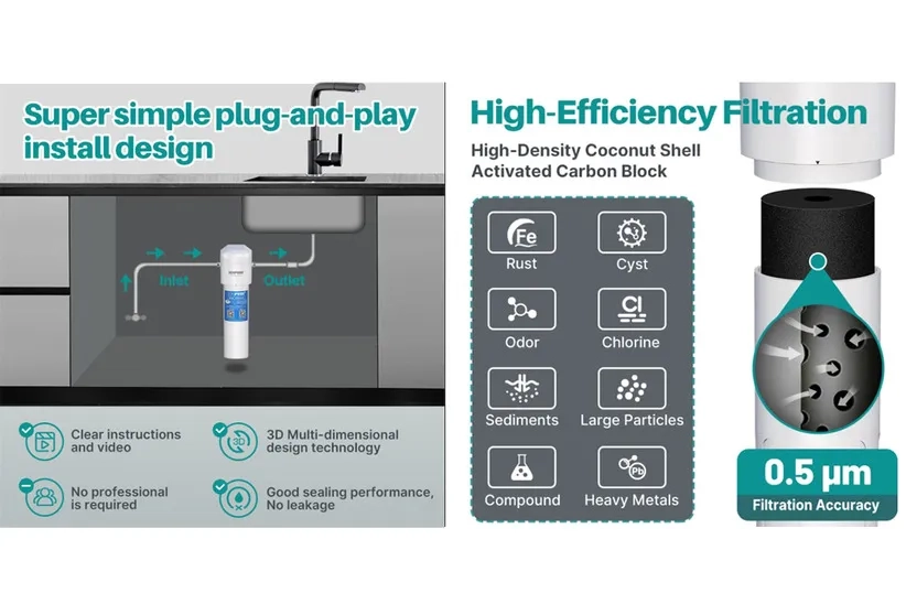 The Simpure 5-stage under sink water filter gives access to healthy water and keeps you and your family hydrated all day. This system reduces up to 99.9% of contaminants, including lead, arsenic, zink, cadmium, chlorine, nitrate, fluoride, microplastics, PFAS, and more. This under sink water filtration system is pre-assembled with American plumbing fittings and comes with a European-style kitchen faucet, which is made of SUS304 stainless steel and lead-free material. By following the instructions, you can easily install this system on your own, as it has a hassle-free installation process.