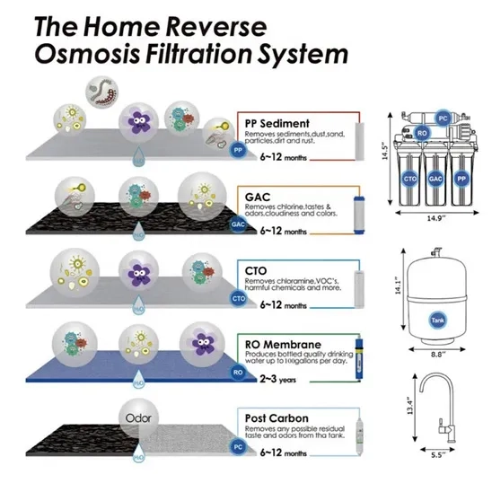 To improve the taste of your cooking, coffee, ice, and drinks, buy the Express ROALK5D under sink filter and experience true RO purification. This system removes up to 99.99% of contaminants including Lead, Chlorine, Fluoride, Cyanide, Giardia, Radium, Asbestos, Calcite, Heavy Metal, Bacteria, Viruses, Pharmaceuticals, and over 100 other contaminants. This product includes a long-lasting filter and you only need to change your filters every six months. It is the best for house, apartment, residential, industrial, machine, and office uses.