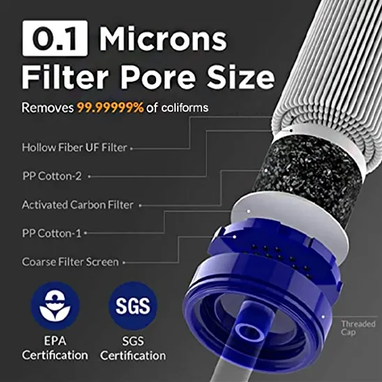 Special feature | Protects against 99.999999% of bacteria (including E.coli, and Salmonella), 99.999% of parasites (including Giardia and Cryptosporidium), 99.999% of microplastics, dirt, sand, and cloudiness |