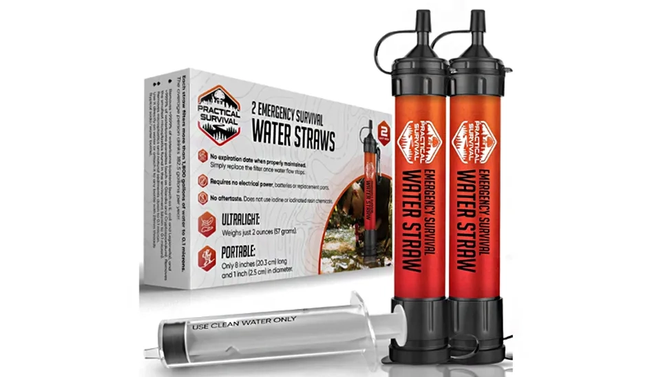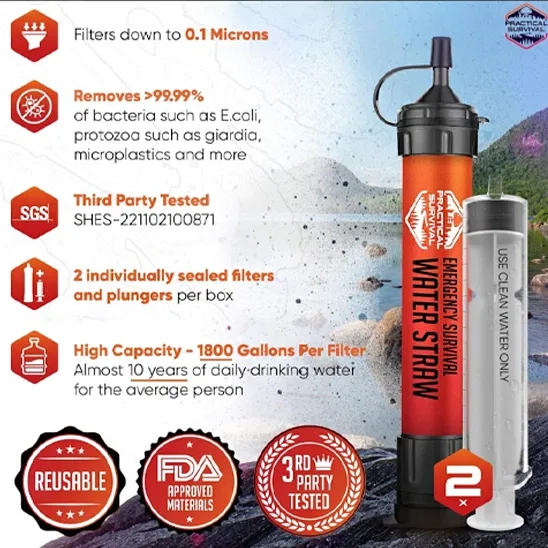 The Practical Survival straw water filter weighs only 2oz and is ideal for camping, hiking, and other outdoor activities. This product can also be used in natural disasters and emergencies when access to clean water is impossible. This filter can remove up to 99.99% of waterborne bacteria (E. coli and Legionella) and parasites (giardia and cryptosporidium) and eliminate the smallest microplastics down to 0.1 micron.