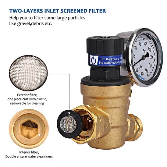 To protect water pipes from damage due to high water pressure, RVGUARD specifically caters to campers, trailers, and RV plumbing systems. This model is made from class C46500 lead-free brass using hot casting process technology and meets all requirements; each regulator undergoes rigorous testing to ensure lead content is below 0.13%, well under the NSF lead-free requirements, to become a perfect choice for customers and gives a safe and healthy service. This RV water pressure regulator with gauge features a 3 ⁄4'' garden hose thread for compatibility with all American water sources and includes an inlet screen to filter out impurities. All those features have provided a pleasant experience to ensure the water has proper pressure according to users’ desires.