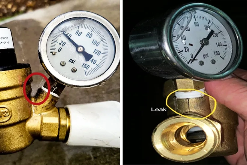 This water pressure regulator started leaking through the plastic cap on the gauge only at the fourth use and raised concerns about its reliability.