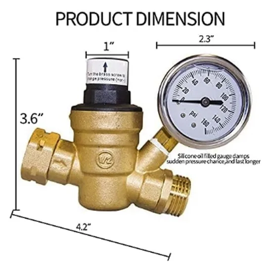The VINAUO water regulator for RV campers is a top-of-line product designed to ensure optimal water pressure and safety. This regulator features an adjustable handle and a built-in gauge, allowing for easy pressure adjustment without the need for tools. It is constructed from C4650 lead-free brass using hot casting process technology, this regulator is NSF compliant, guaranteeing healthy water for water systems.