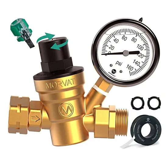 The Morvat water regulator is made from lead-free durable brass to ensure longevity and strength. It can be easily adjustable from 0-160 psi and is compatible with US 3⁄4-inch water sources and NH threads. This product is crafted from lead-free brass with a lead content of less than 13% and meets NSF standards for safety. With simple instructions, you can easily install this regulator to keep your RV and camper systems safe. The Morvat water regulator reduces strain and prevents damage caused by high water pressure.