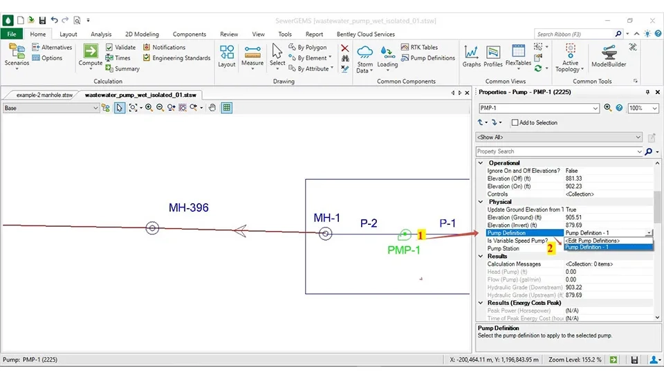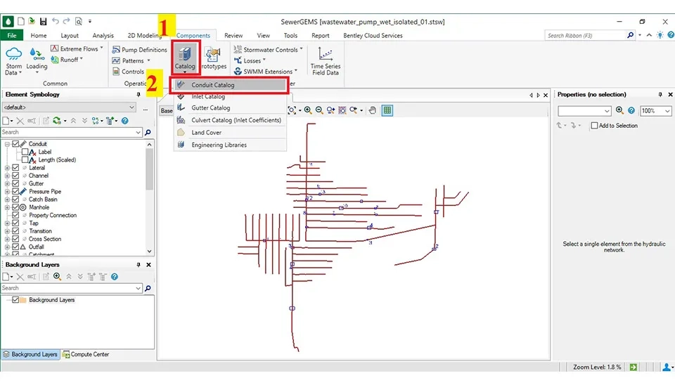 To import the wet well and lift station, you need to select the wet well and pump in the layout in the SewerGEMS software. The conduits that connect the wet well to the pump and the pump to the manhole must be changed by right-clicking on the conduit and selecting 'Morph Pressure Pipe to Conduit' (fig. 36).
