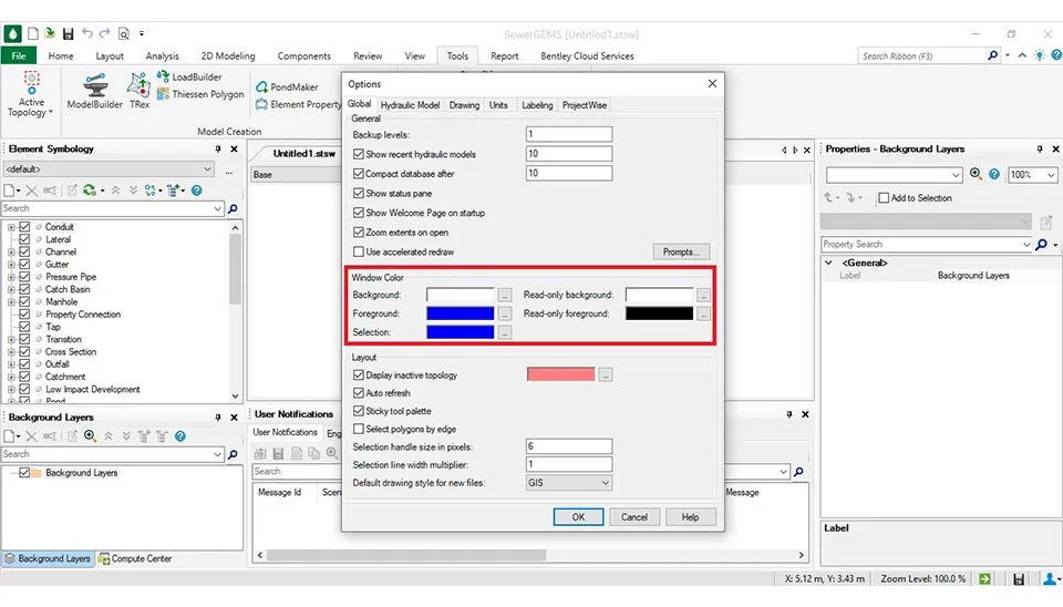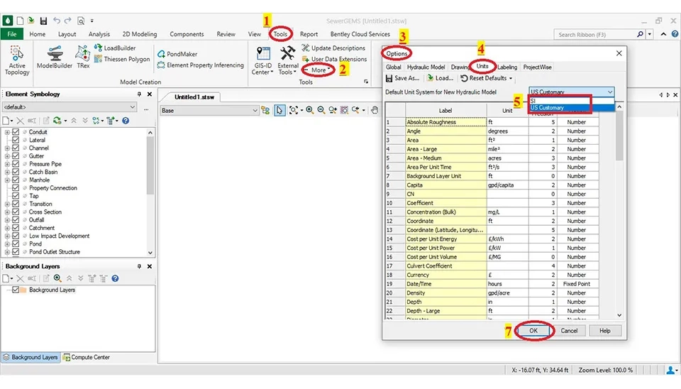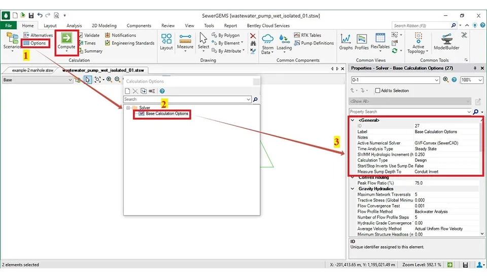 There are some methods to design in the SewerGEMS software. First, select ‘’Option’’ in the ‘’Home’’ part that opens a dialog box with the name ‘’Calculation Options’’. After that, it chooses ‘’Solver’’ ⇾ ‘’Base Calculation Options’’. Next, it will open a dialog box with the name ‘’Properties - Solver - Base Calculation Options’’ that there are some items in this box that must opt based on the design.