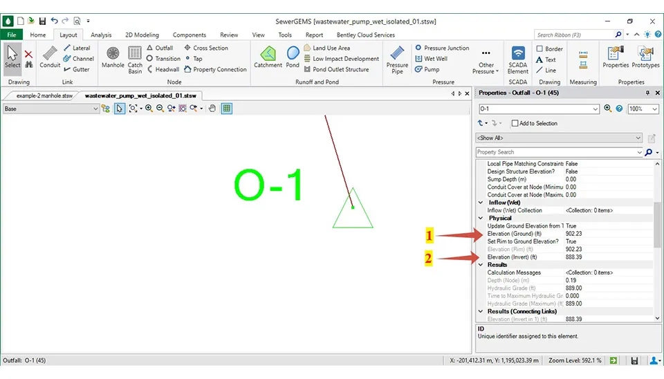 The point of the output is called Outfall in SewerGEMS. Placing the outfall is the last step in the design and analysis. To import the Outfall, use the 'Outfall' tool in the 'Layout' section of the software. It is crucial to place the Outfall in the lowest elevation because the wastewater system is by gravity (fig. 44).