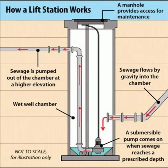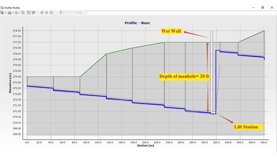 When the depth of the manhole is more than about 20 ft (6 meters) in design, it needs to use a lift station. So that the sewage of the manhole can enter the wet well, then a lift station will be used, and the sewage will be transferred to a manhole that has a height of 3 ft (0.9 m) relative to the earth. Again, all method calculations will be done for this manhole, other manholes, and pipes until the depth of the manhole is taken to be more than about 20 ft (6 meters).