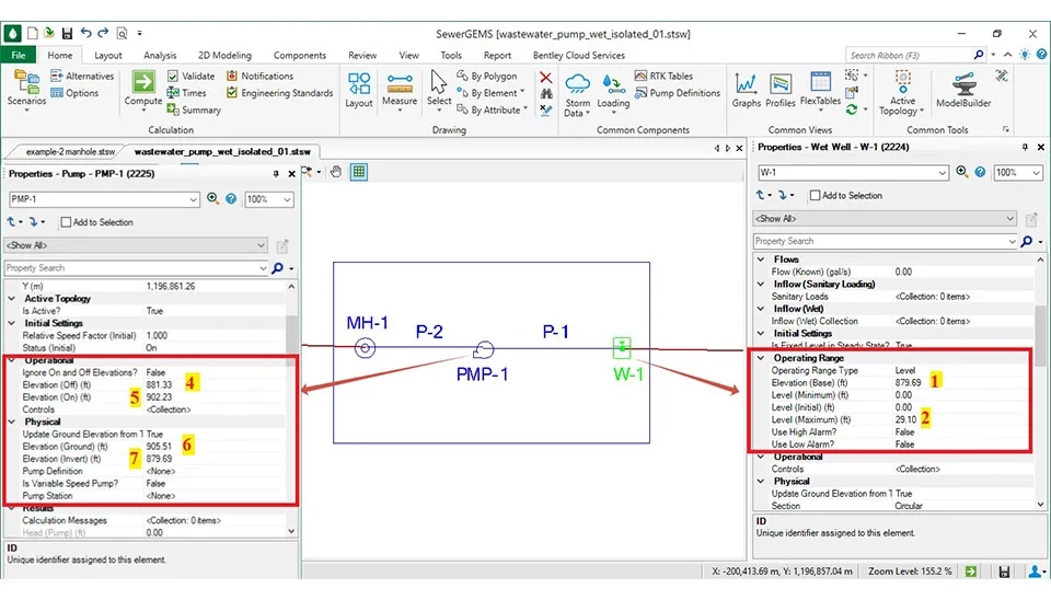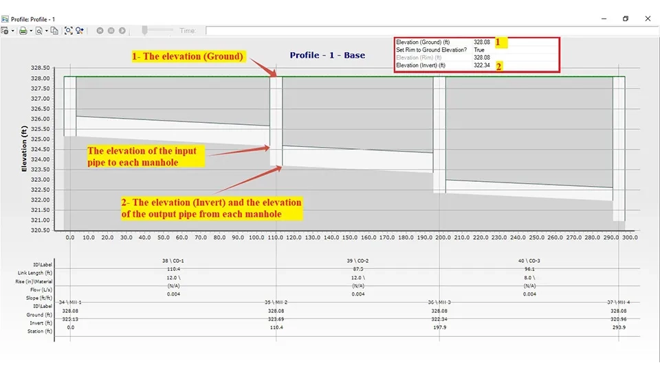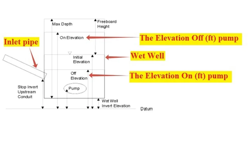 The Base Elevation (ft) and the Maximum Level (ft) are the main information needed for each wet well. The elevation (base) (ft) can equal the elevation of the last manhole. Also, the level (maximum) (ft) can be equal to the elevation of the earth or more to avoid entering the surface water of rain into the wet well.