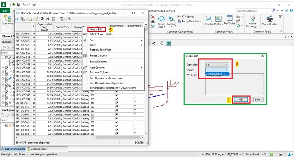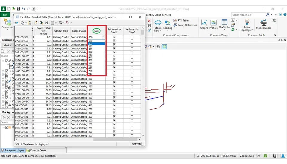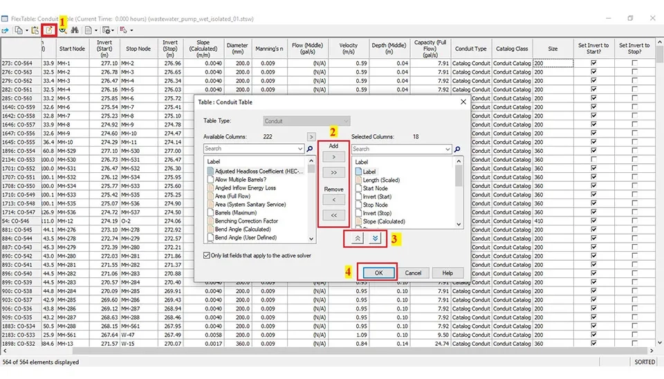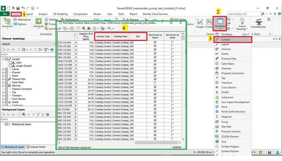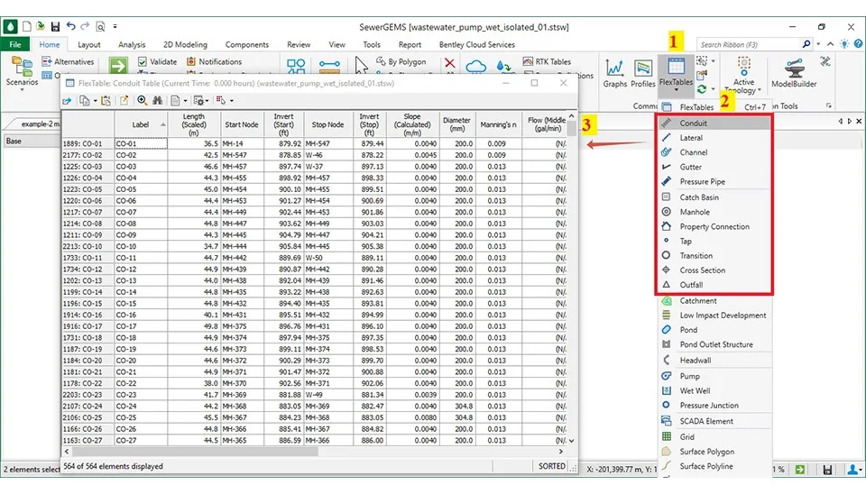 First click the Flex Tables on the Home Part in the SewerGEMS software to see all features of the output of the model. The main items are the conduit is the length of the pipe, the velocity, the slope, and other things. Also, the manhole includes the Rim and the Ground elevation. Additionally, the lift station includes information about each pump (Fig. 47).