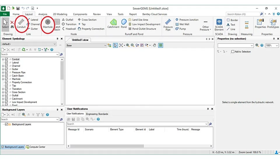 importing the geography map of the desired area, and adding components such as conduits, manholes, lift stations, pumps, and wet wells.