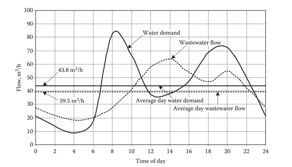 Like water demand, wastewater flows also vary in terms of time of the day, day of the week, weather conditions, and year's season. Under dry weather conditions, the daily wastewater flows show a diurnal pattern exhibiting a peak and a minimum in 24 hours. The diurnal wastewater flow parallels that of water demand with a time lag of a few hours (Fig. 3).