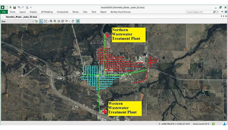 Henrietta is the target city for designing wastewater with the SewerGEMS software. There are two water treatments in Henrietta that need to divide the design into two parts. The population in 2054 was predicted to be 3900 people; the wastewater was calculated at 18.62 gal/s, and the inflow and infiltration were estimated at 28.96 gal/s. Consequently, the minimum total design flow was calculated at 30.13 gal/s. A minimum diameter of 8 inches (200 mm) was used for designing.The total design requires 19 lift stations. The total length of the pipe is 88,100.9 ft (26853.15 m) for the design.