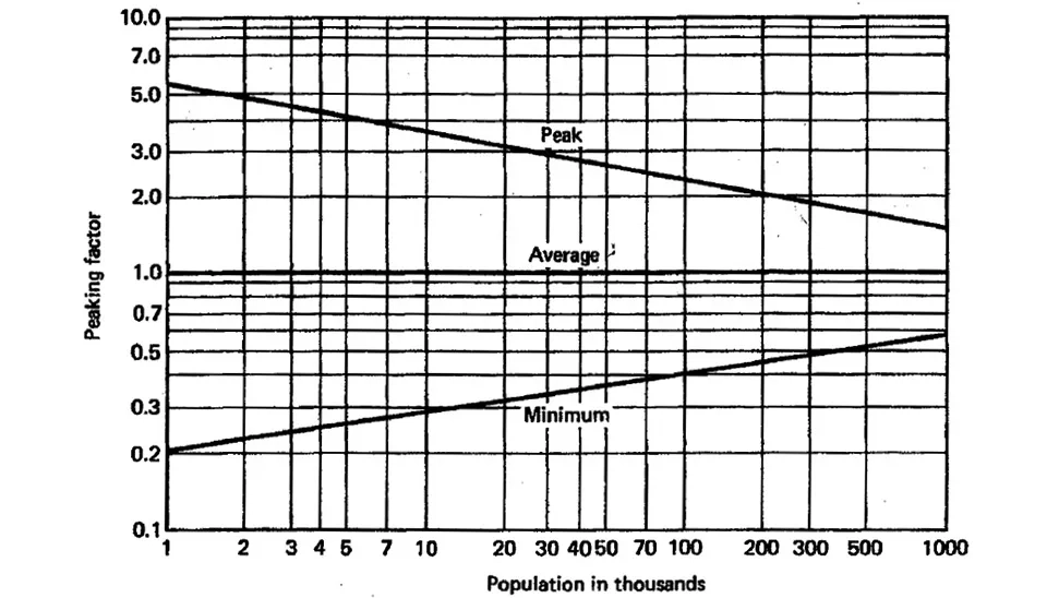 We generally estimate the hourly peak and minimum dry weather flows using several equations and graphical relationships developed from case studies. The ratio of hourly peak to the daily average and hourly minimum daily average flows depend upon the contributing population (Syed R. Qasim, Second Edition & Tchobanoglous and Shroeder, 1985).